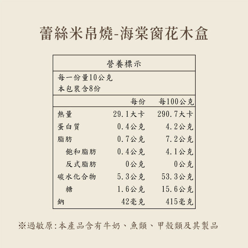 ♦過敏原警語:本產品生產製程廠房,其設備或生產管線有處理蛋、牛奶、含麩質之穀物、大豆、花生、芝麻、椰子、芒果、堅果類、魚類、甲殼類等及其製品,對其過敏體質者請留意