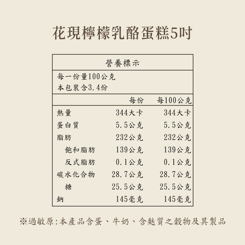 乳酪(鮮奶油,乳糖,乳蛋白,糖,鹿角菜膠,鹽,檸檬酸鈉,多磷酸鈉),雞蛋,糖,奶油,麵粉,檸檬汁,優格,玉米粉,鮮奶油(鮮乳脂,鹿角菜膠),吉利丁粉(明膠)(豬皮萃取物),鹽,檸檬皮
