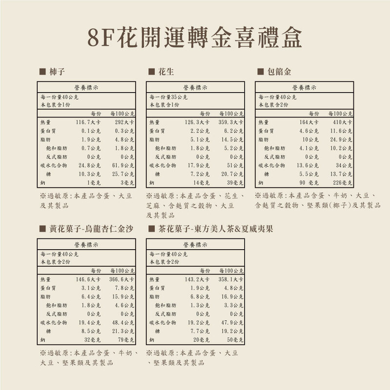 40g/入。柿子1+花生1(35g/入)+包餡金2+茶花菓子2+黃花菓子2